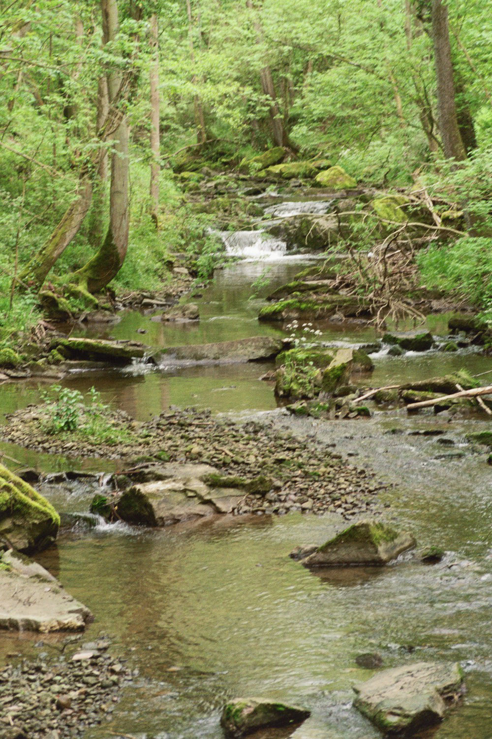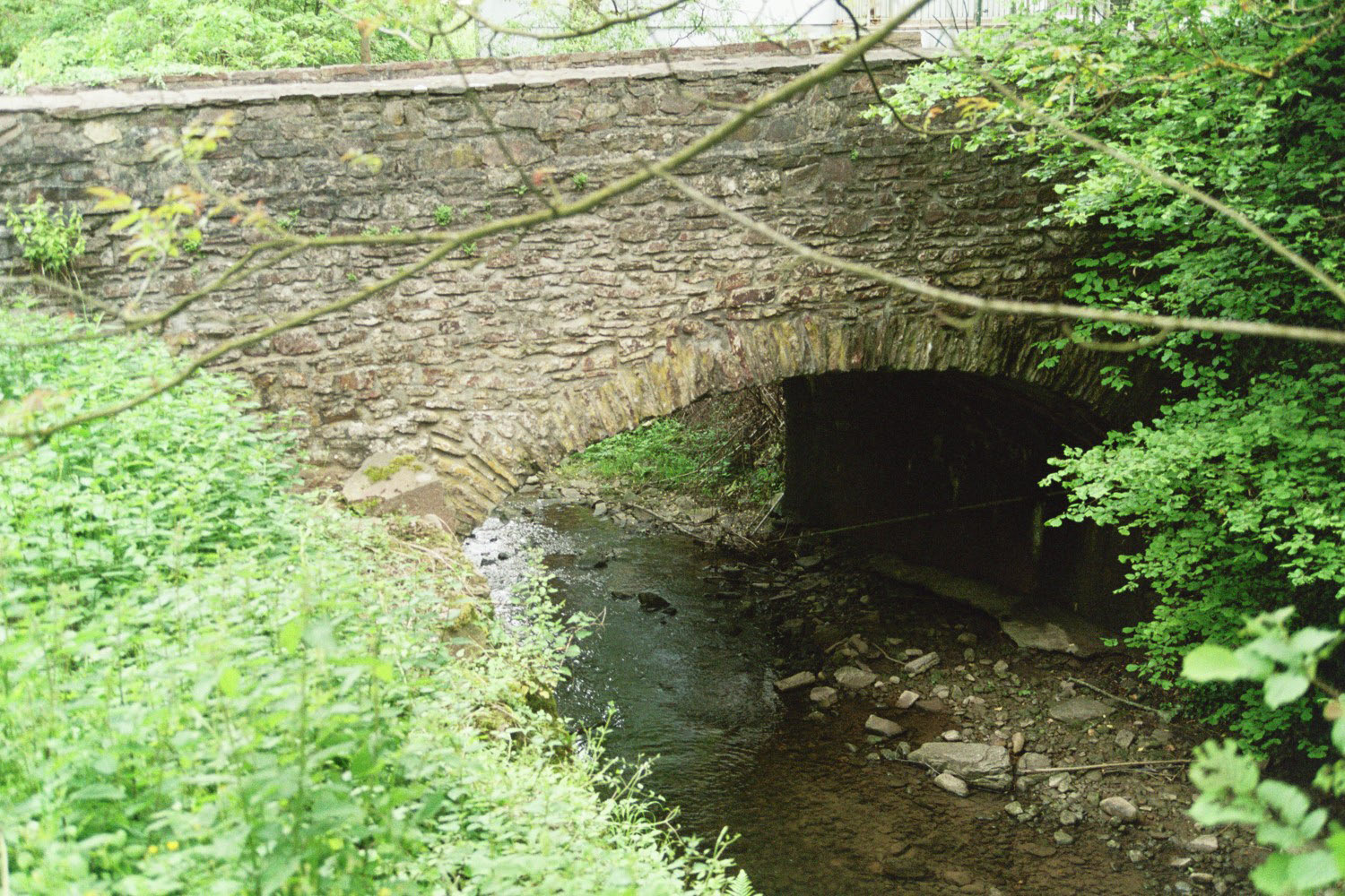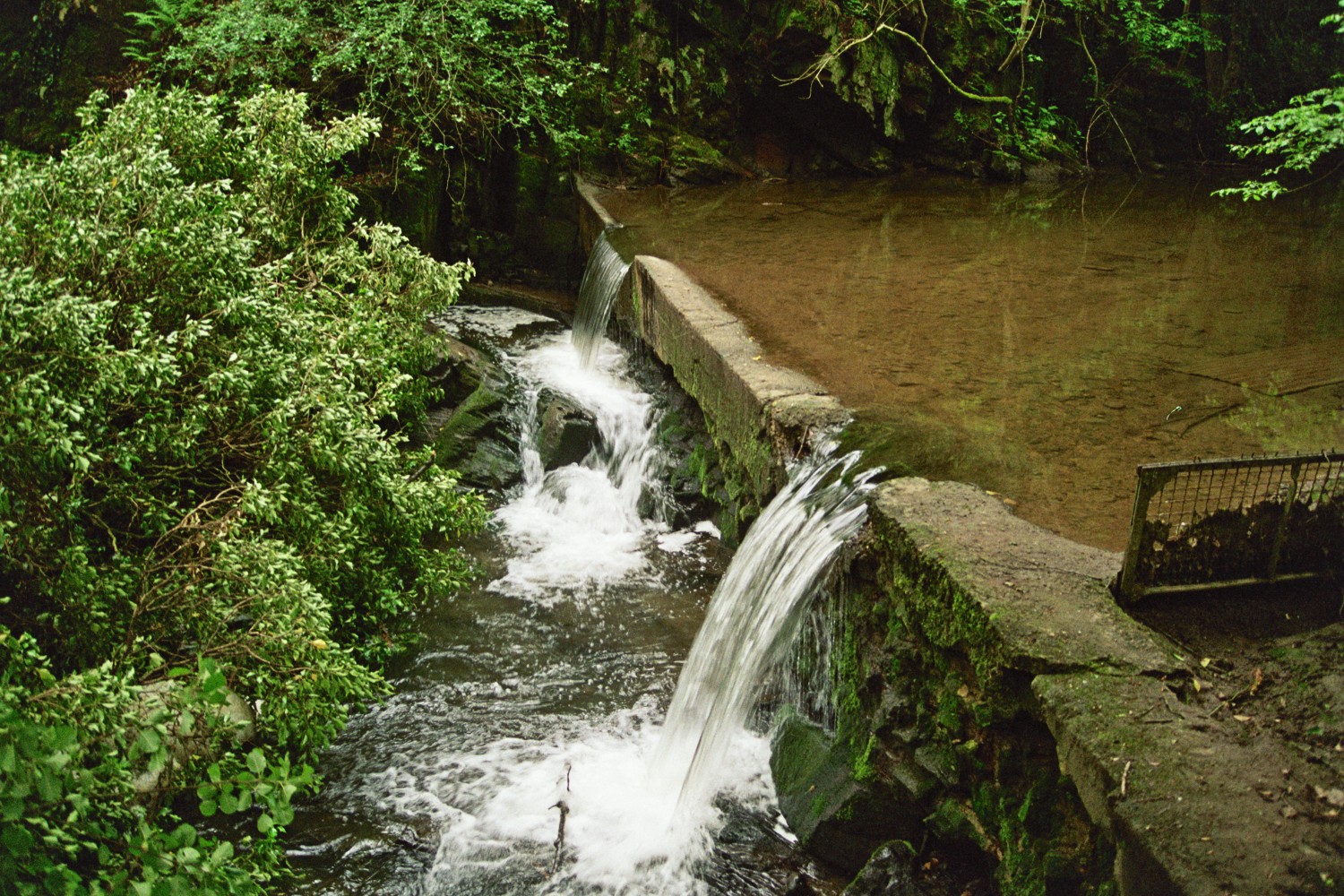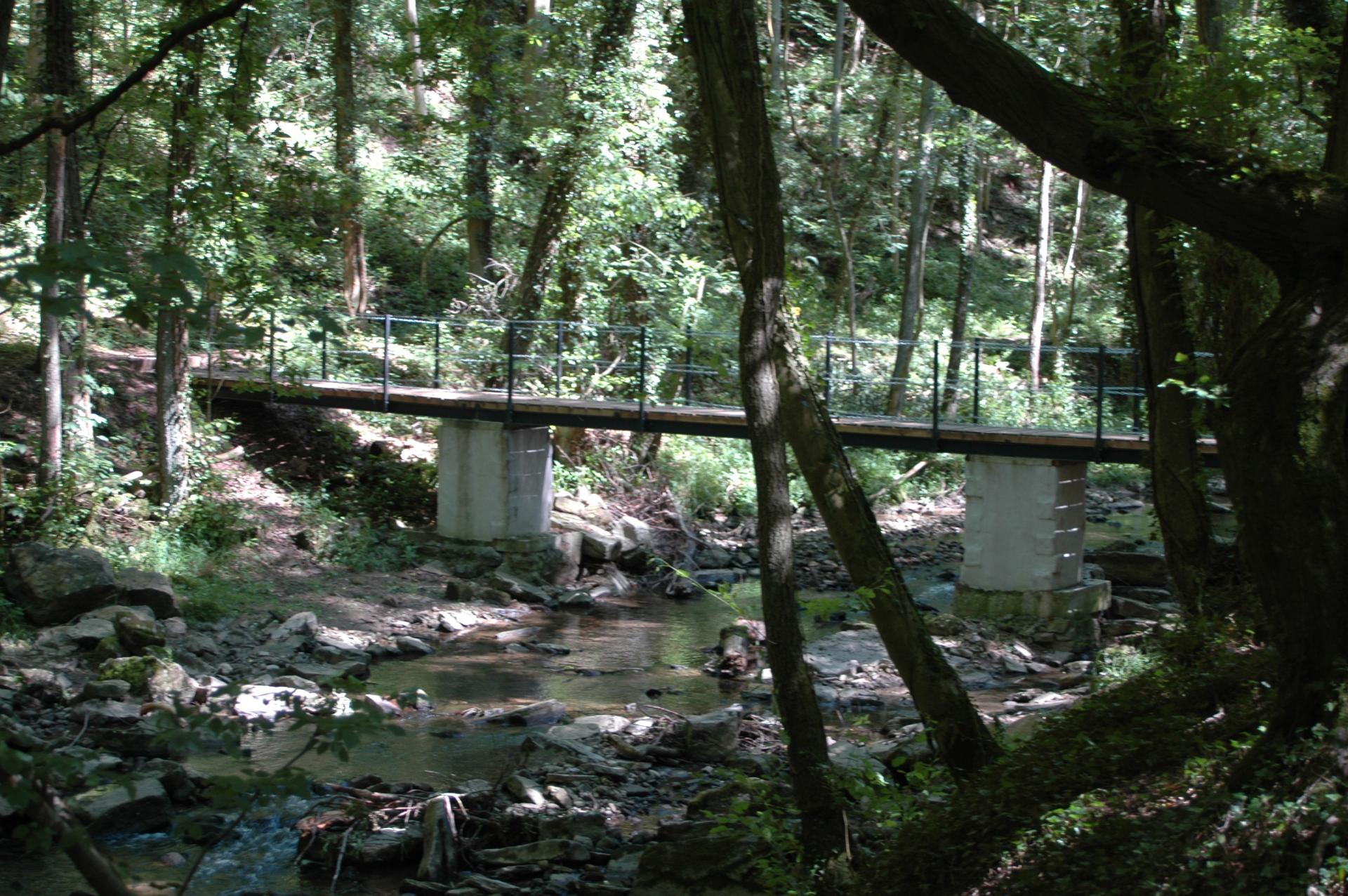 Revenir vers le pont puis tourner à gauche et suivre les balises (rectangle blanc , rectangle rouge ). Vous arrivez près d'une chute d'eau qui servait au vieux moulin.
